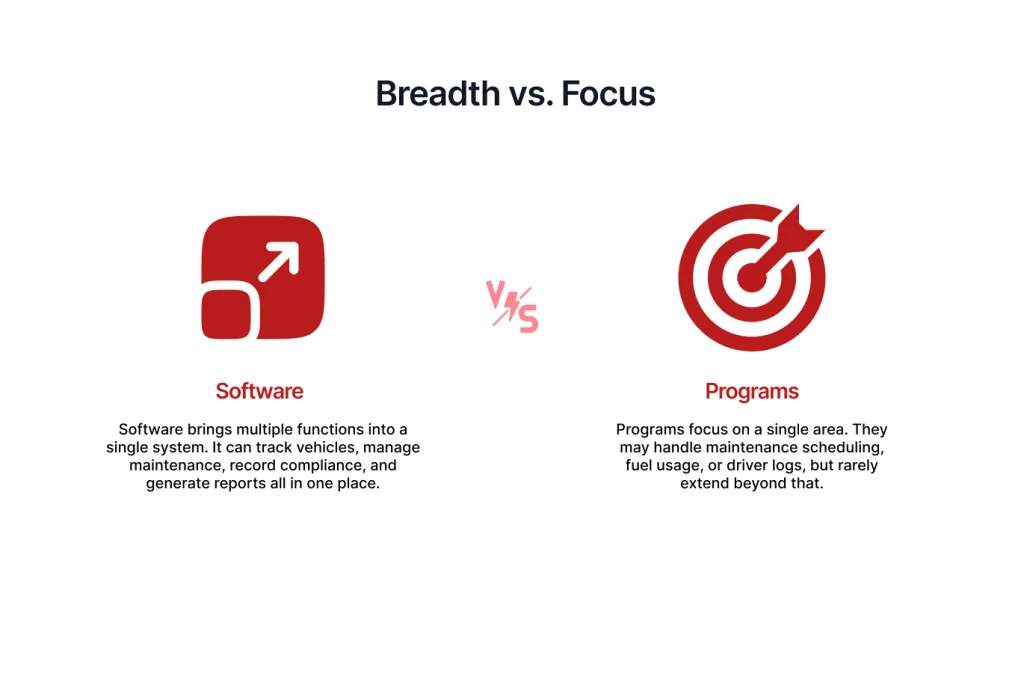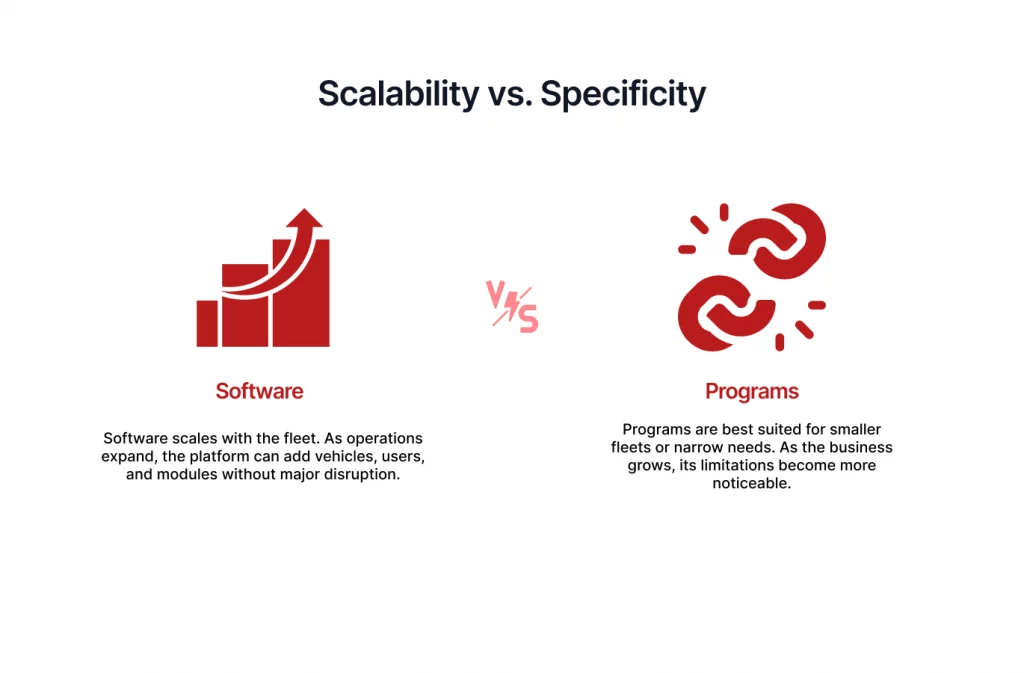 Choosing between software and programs depends on your operational needs. Small fleets may prefer programs for simplicity, while growing fleets often need full-featured platforms.