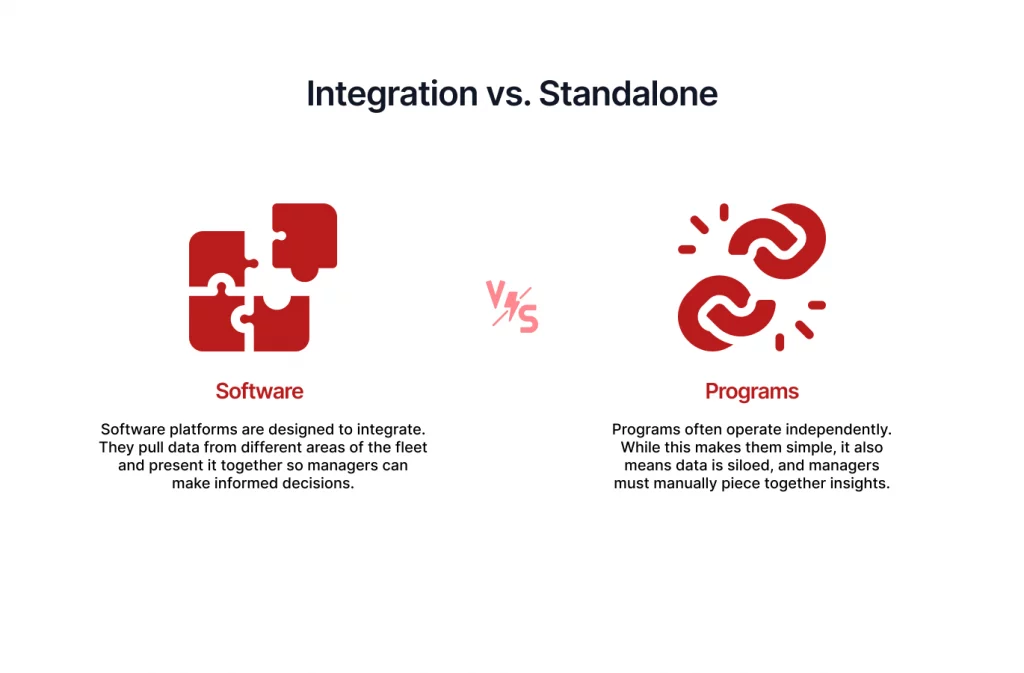 Neither is inherently better; the choice depends on your needs. Programs are simple and cost-effective for small, focused tasks. At the same time, software provides broader visibility and scalability for fleets that need an integrated solution.